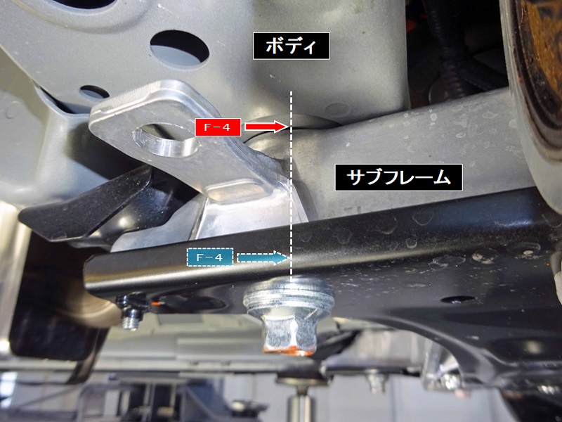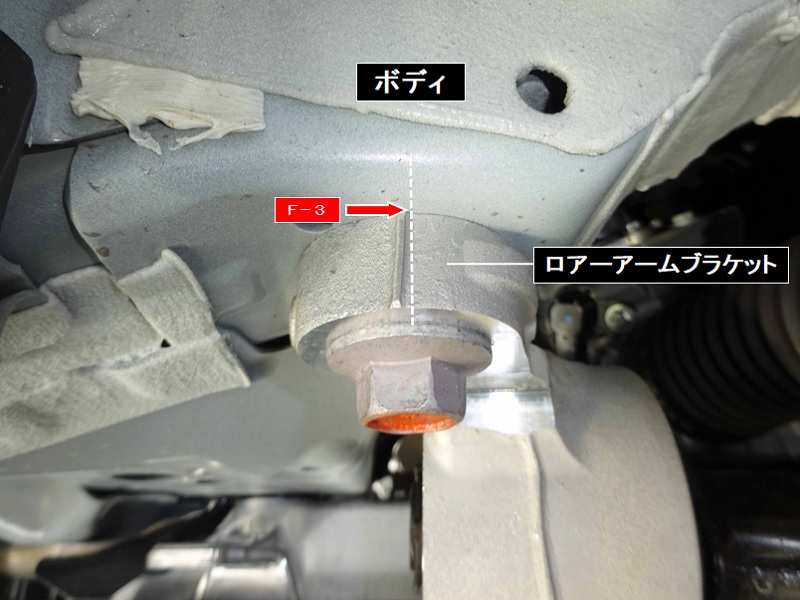リジカラ取付箇所であるサブフレームは、母材の精度誤差をはじめ、ボルトと穴径との内外径公差、カラーの鉸まり具合、他にも様々な部分の確認が必要になります。